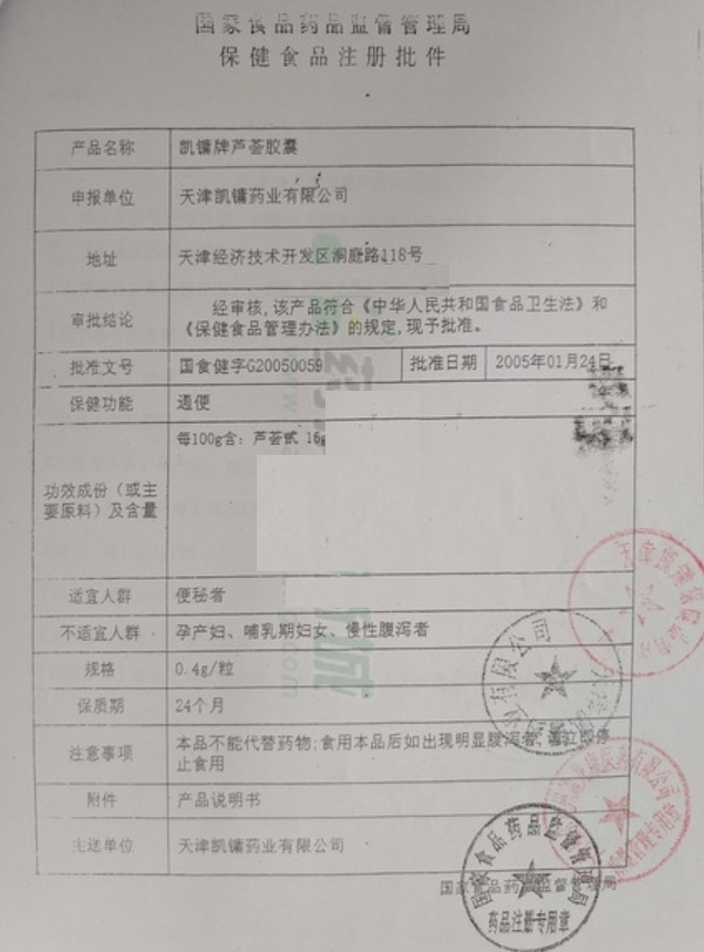 凱鏞牌蘆薈膠囊保健功能:通便;適宜人群:便秘者;不適宜人群:孕產(chǎn)婦、哺乳期婦女、慢性腹瀉者。 每日2次,每次1粒。本品不能代替藥物;食用本品后如出現(xiàn)明顯腹瀉者,請立即停止食用。