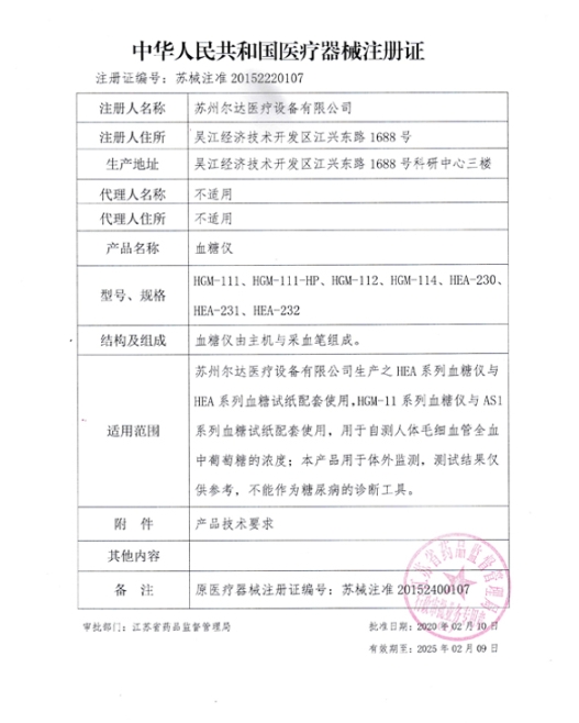 蘇州爾達(dá)醫(yī)療設(shè)備有限公司生產(chǎn)之HEA-232血糖儀與HEA系列血糖試紙配套使用,HGM-11系列(HGM-112、HGM-114)血糖儀與AS1系列血糖試紙配套使用,用于自測(cè)人體毛細(xì)血管全血中葡萄糖的濃度;本產(chǎn)品用于體外監(jiān)測(cè),測(cè)試結(jié)果僅供參考,不能作為糖尿病的診斷工具。