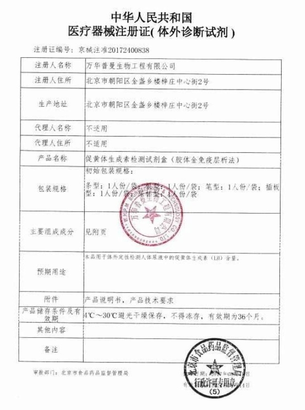 促黃體生成素檢測試劑盒(膠體金免疫層析法)(樂夫/排卵檢測試紙)試紙條主要由硝酸纖維素膜、聚酯膜、玻璃纖維、濾紙、塑料板組成。用于體外定性檢測人體尿液中的促黃體生成素(LH)含量。4℃~30℃避光干燥保存,不得凍存。