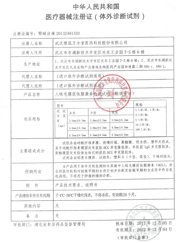 一測(cè)安早早孕檢測(cè)試紙(膠體金法)檢測(cè)原理:本產(chǎn)品采用層析式雙抗夾心一步法技術(shù),以膠體金為指示標(biāo)記,檢測(cè)尿液中HCG濃度,判斷是否懷孕。本試紙最低檢出量為25mIU/ml。本產(chǎn)品供各級(jí)醫(yī)療機(jī)構(gòu)對(duì)早孕患者進(jìn)行初步診斷及患者在家中作自我檢測(cè)用。