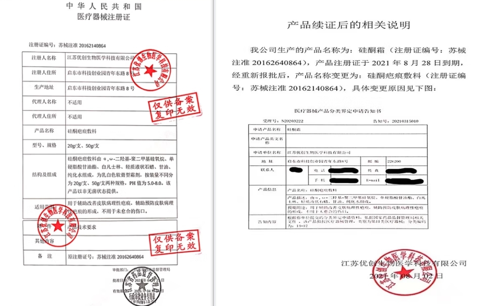 江蘇優(yōu)創(chuàng)硅酮疤痕敷料50g對應條形碼6952007716016裝的換新包裝了,新包裝產(chǎn)品名稱及注冊號為“硅酮疤痕敷料(蘇械注準20162140864)”,舊包裝產(chǎn)品名稱及注冊號為“硅酮霜(蘇械注準20162640864)”。都質(zhì)量保證,新舊包裝隨機發(fā)貨