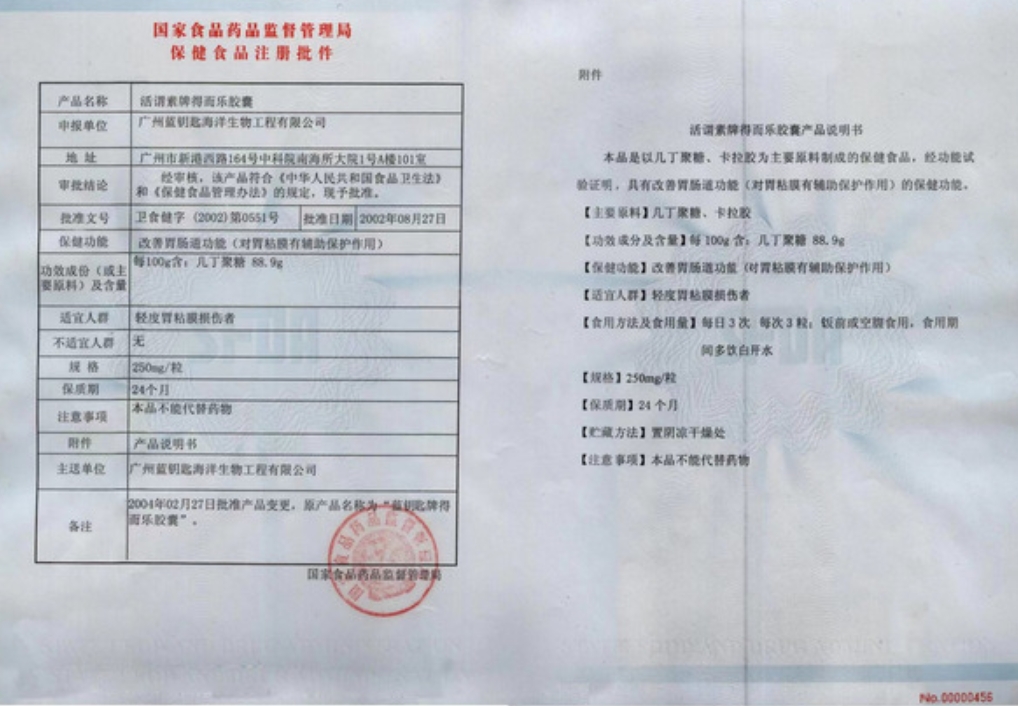 活謂素牌得而樂膠囊保健功能:改善胃腸道功能(對胃粘膜有輔助保護(hù)作用);適宜人群:輕度胃粘膜損傷者;不適宜人群:無 。每日3次,每次3粒;飯前或空腹食用,食用期間多飲白開水。本品不能代替藥物。
