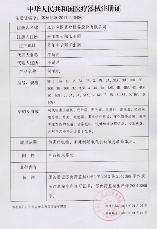 9F-5制氧機(jī)(魚躍)基本參數(shù):氧濃度≥90%(V/V);水分含量:≤0.07g/m3;二氧化碳含量:≤0.01%(V/V);固體物質(zhì)粒徑:≤10μm;流量計測量范圍有0~5L/min、0~10L/min兩種;輸出壓力有0.02~0.05Mpa、0.04~0.07MPa兩種;噪音≤60dB;具有霧化功能的制氧機(jī)霧化率應(yīng)達(dá)0.1mL/min。