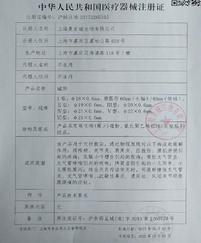 曼吉磁貼V型由磁粉、氯化聚乙烯(CPE)及粘貼劑組成。用于穴位敷貼,對(duì)小兒厭食癥起輔助治療作用。貼敷前保持皮膚清潔、干燥;將磁貼從防粘紙上剝下,遵醫(yī)囑或根據(jù)病癥選擇相關(guān)穴位貼敷,24小時(shí)內(nèi)換貼。破損皮膚、孕婦、裝有心臟起搏器及過(guò)敏性體質(zhì)患者禁用。