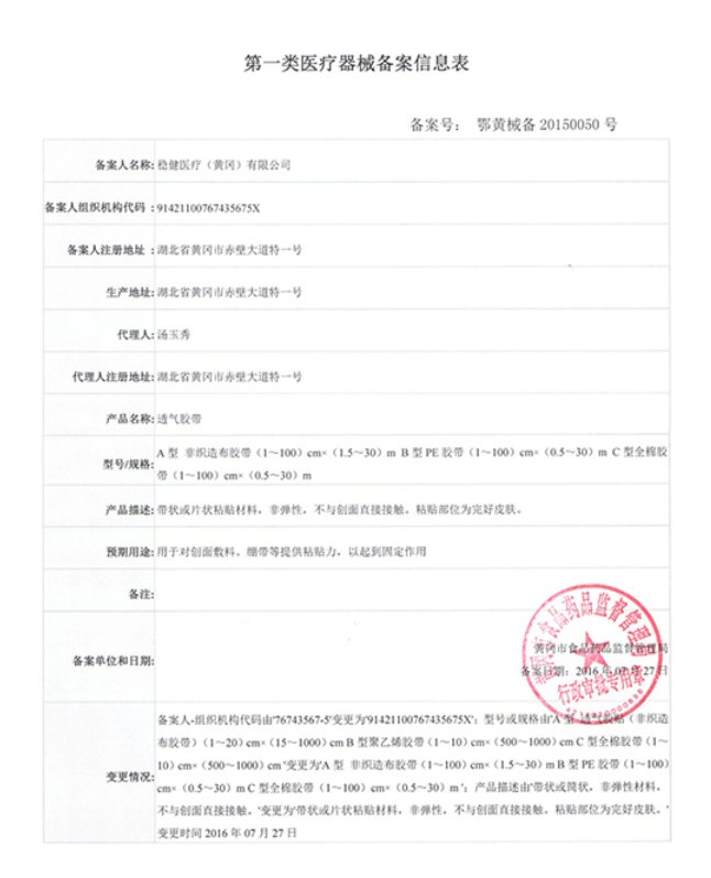 A型透氣膠帶(穩(wěn)健醫(yī)療)由非織造布基材、膠質組成。本產(chǎn)品未滅菌,使用者可根據(jù)用途決定是否滅菌后使用。用于臨床外科手術包扎、輸液固定等。本產(chǎn)品為一次性用品,不宜重復使用。本產(chǎn)品適用于清潔干凈的皮膚,請勿將膠帶中心直接粘于傷口處。用后應按醫(yī)院或環(huán)保部門要求處置廢物。
