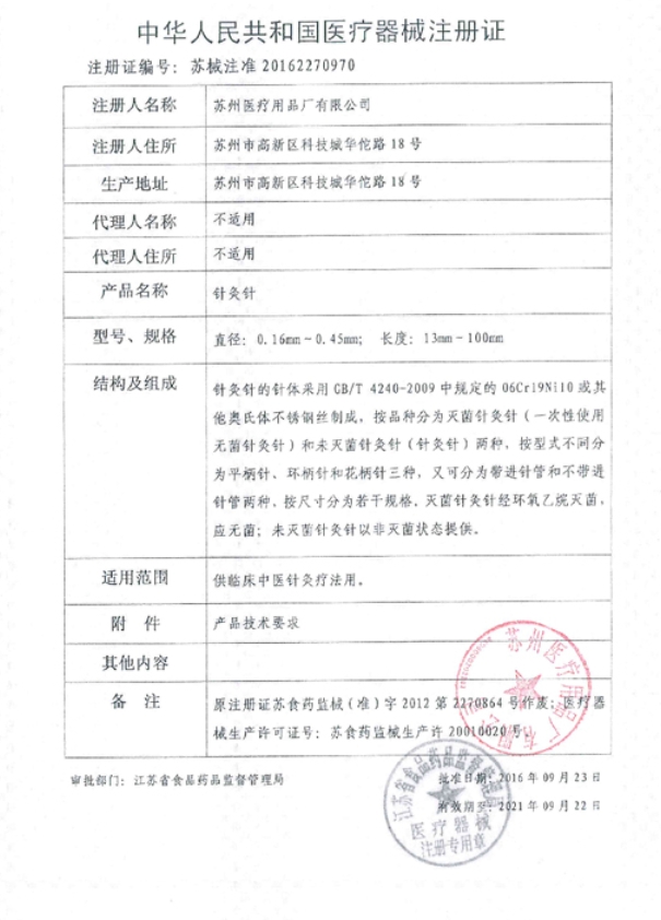 針灸針(華佗牌)的針體采用OCr19Ni9或其他奧氏體不銹鋼絲制成,按品種分為滅菌針灸針和未滅菌針灸針兩種,按型式不同分為平柄針、環(huán)柄針、花柄針三種,又可分為帶進針管和不帶進針管兩種,按尺寸不同分為若干規(guī)格,滅菌針灸針應無菌。