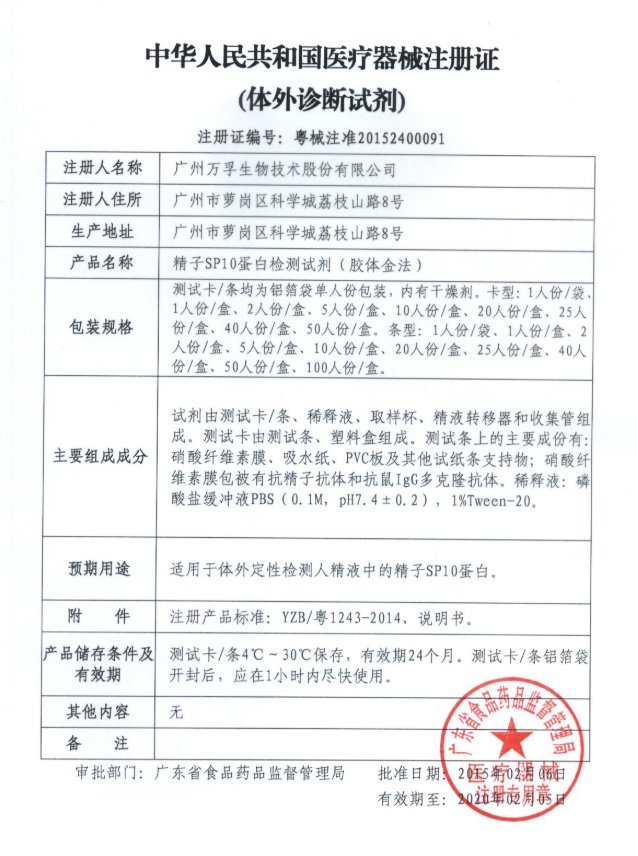 萬孚精子SP10蛋白檢測試劑(膠體金法)適用于體外定性檢測人精液中的精子SP10蛋白。4℃~30℃保存,有效期24個月。測試卡/條鋁箔袋開封后,應(yīng)在1小時內(nèi)盡快使用。