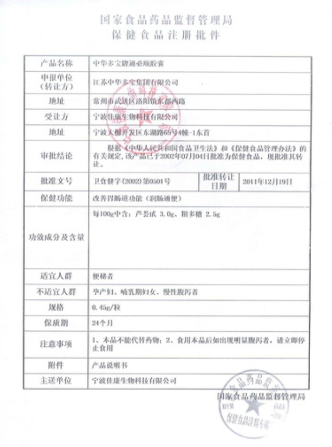 中華多寶牌通必順膠囊保健功能:改善胃腸道功能(潤腸通便);適宜人群:便秘者;不適宜人群:孕產(chǎn)婦、哺乳期婦女、慢性腹瀉者。本品不能代替藥物;食用本品后如出現(xiàn)明顯腹瀉者,請立即停止食用。
