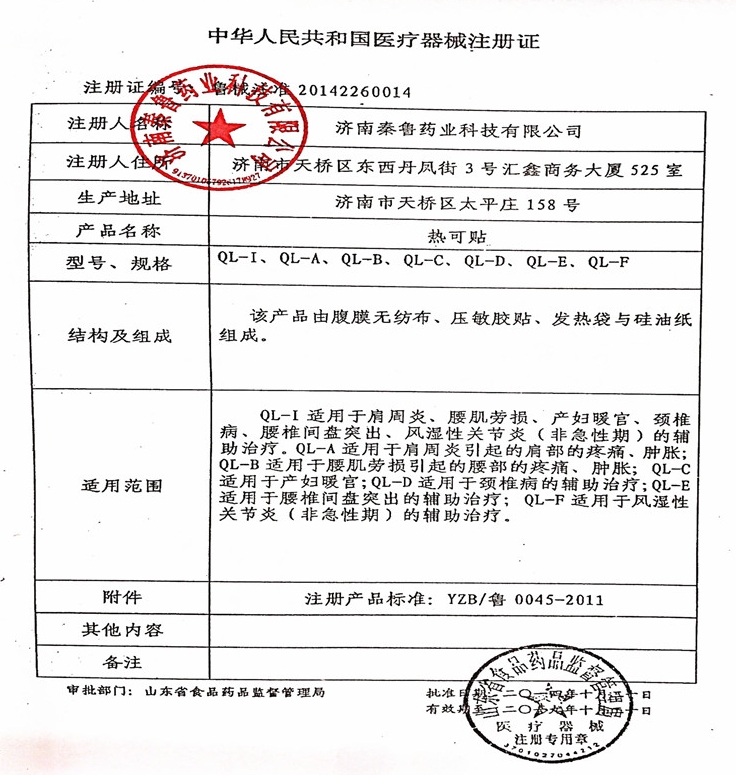 熱可貼(暖宮貼)由敷膜無紡布、壓敏膠貼、發(fā)熱袋與硅油紙組成。適用于產(chǎn)婦暖宮。產(chǎn)品標準:YZB/魯0045-2011。生產(chǎn)地址:山東單縣經(jīng)濟技術開發(fā)區(qū)食品藥品產(chǎn)業(yè)園山東朱氏藥業(yè)集團有限公司6號廠房。