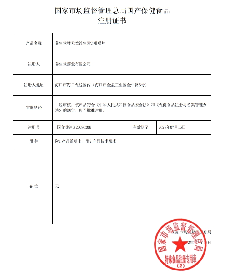 養(yǎng)生堂牌天然維生素C咀嚼片保健功能:本品經(jīng)動(dòng)物實(shí)驗(yàn)評(píng)價(jià),具有增強(qiáng)免疫力的保健功能;適宜人群:免疫力低下者;不適宜人群:3歲以下人群。本品不能代替藥物。