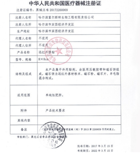 廣醫(yī)慈遠紅外臍貼屬于外用貼劑,由醫(yī)用壓敏膠帶和磁石餅組成,磁石餅為遠紅外基材粉末、磁石粉、磁石片、羊毛脂混合構(gòu)成。用于單純性肥胖。嚴重膠布過敏者慎用;臍部皮膚破潰者禁用;十二歲以下兒童、孕育及哺乳期婦女禁用。保持心情平靜,勿暴飲暴食。
