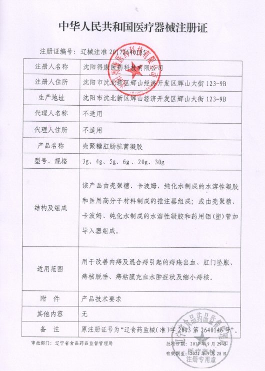 殼聚糖肛腸抗菌凝膠(綠傘/痔好)由殼聚糖、卡波姆、純化水制成的水溶性凝膠和醫(yī)用高分子材料制成的推注器組成;或由殼聚糖、卡波姆、純化水制成的水溶性凝膠和藥用鋁(塑)管加導(dǎo)入器組成。用于改善內(nèi)痔及混合痔引起的痔瘡出血、肛門墜脹、痔核脫垂、痔粘膜充血水腫癥狀及縮小痔核。