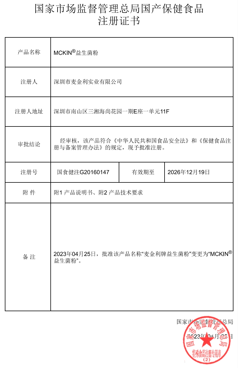 國食健注G20160147的麥金利益生菌粉30g(1.5g*20袋)對應條形碼“6937588931492”裝的換新包裝了,新包裝產(chǎn)品名稱為“MCKIN?益生菌粉”,舊包裝產(chǎn)品名稱為“麥金利牌益生菌粉”。里面的益生菌粉質量不變,只是更換了包裝盒,新舊包裝隨機發(fā)貨