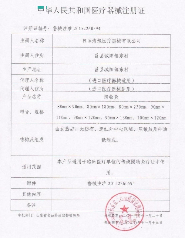 海旭隔物灸由發(fā)熱袋、無(wú)紡布、遠(yuǎn)紅外中心區(qū)域、壓敏膠及硅油紙制成。適用于臨床醫(yī)療單位的傳統(tǒng)療法中使用。本品僅限一次性使用,用后銷毀,包裝如有破損,嚴(yán)禁使用。敷貼后無(wú)熱感,如有過(guò)敏等不適,應(yīng)停止敷貼。