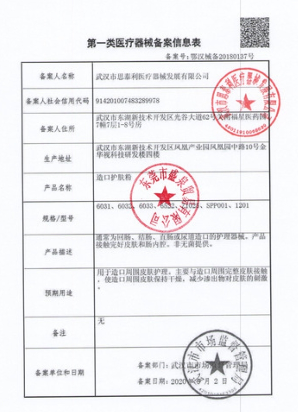 思泰利造口護(hù)膚粉用于造口周圍皮膚護(hù)理。主要與造口周圍完整皮膚接觸,使造口周圍皮膚保持干燥,減少滲出物對皮膚的刺激。通常為回腸、結(jié)腸、直腸或尿道造口的護(hù)理器械。產(chǎn)品接觸完好皮膚和腸內(nèi)腔。非無菌提供。