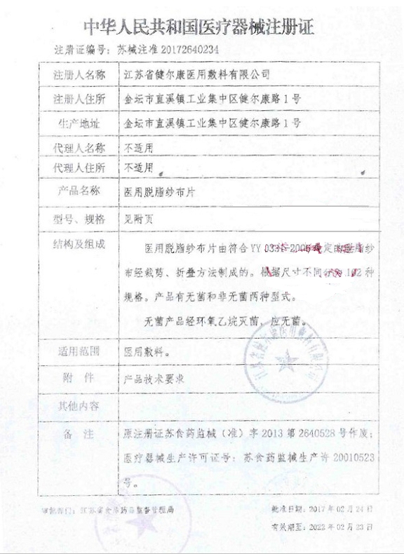 醫(yī)用脫脂紗布片(健衛(wèi)康)由符合YY0331-2006規(guī)定的脫脂紗布經(jīng)裁剪、折疊方法制成的。本品為無菌型式。無菌產(chǎn)品經(jīng)環(huán)氧乙烷滅菌,應(yīng)無菌。本產(chǎn)品為一次性使用醫(yī)療用品。如產(chǎn)品發(fā)生霉變包裝破損等應(yīng)禁止使用。