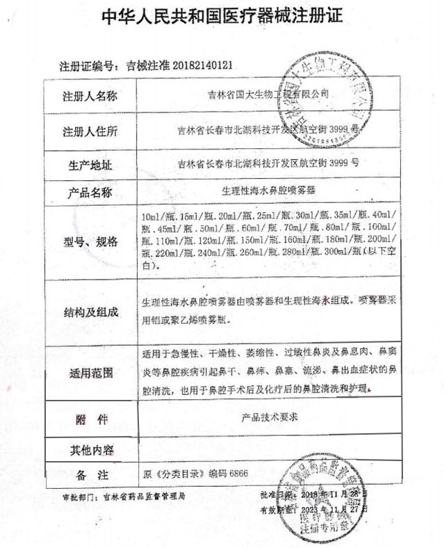 生理性海水鼻腔噴霧器(鼻通/國大生物/國大通克)適用于急慢性、干燥性、過敏性鼻炎及鼻肉息、鼻竇炎等鼻腔疾病引起鼻干、鼻癢、鼻塞、流涕、鼻出血癥狀的鼻腔清洗,也用于鼻腔手術(shù)及化療后的鼻腔清洗和護(hù)理。