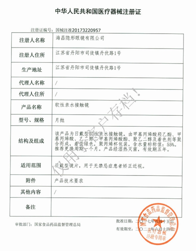 軟性親水接觸鏡(海昌)為日戴型;由甲基丙烯酸羥乙酯、甲基丙烯酸、乙二醇二甲基丙烯酸酯、聚乙二醇及著色劑等聚合而成,著藍(lán)綠色,聚丙烯杯包裝。含水量標(biāo)稱值:55%。推薦更換周期一個(gè)月。產(chǎn)品經(jīng)濕熱滅菌。用于無禁忌癥患者矯正近視。