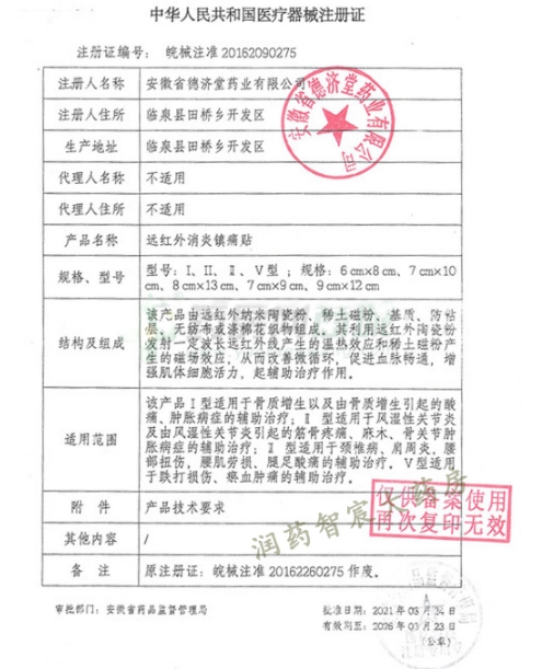 跌打損傷遠(yuǎn)紅外消炎鎮(zhèn)痛貼(萬(wàn)通中方)由遠(yuǎn)紅外納米陶瓷粉、稀土磁粉、基質(zhì)、防粘層、無(wú)紡布或滌棉花織物組成。Ⅴ型適用于跌打損傷、瘀血腫痛的輔助治療。