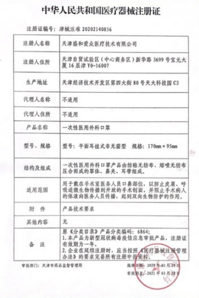 一次性醫(yī)用外科口罩(盛和愛眾)由紡粘無紡布、熔噴無紡布?jí)汉隙傻恼煮w、鼻夾、耳帶組成,用于戴在手術(shù)室醫(yī)務(wù)人員口鼻部位,以防止皮屑、呼吸道微生物傳播到開放的手術(shù)創(chuàng)面,并阻止手術(shù)病人的體液向醫(yī)務(wù)人員傳播,起到雙向生物防護(hù)的作用。