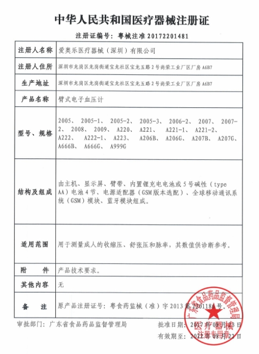 愛(ài)奧樂(lè)臂式電子血壓計(jì)由主機(jī)、顯示屏、臂帶、內(nèi)置鋰充電電池或5號(hào)堿性(type AA)電池4節(jié)、電源適配器(GSM版本選配)、全球移動(dòng)通訊系統(tǒng)(GSM)模塊、藍(lán)牙模塊、NB-IoT通訊模塊組成,用于測(cè)量成人的收縮壓、舒張壓和脈率,其數(shù)值供診斷參考。