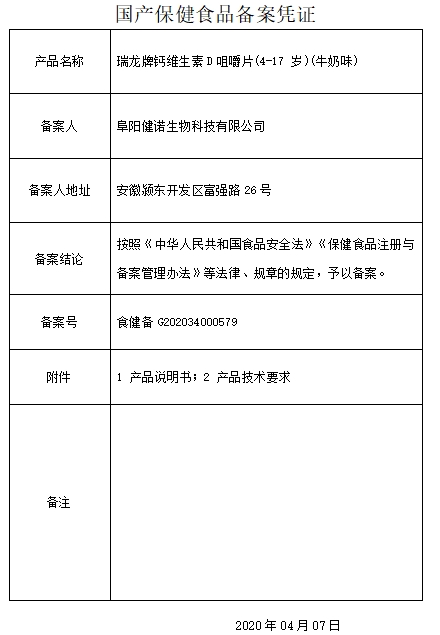 瑞龍牌鈣維生素D咀嚼片(4-17歲)保健功能:補充鈣、維生素D;適宜人群:需要補充鈣、維生素D3的4-17歲人群;不適宜人群:3歲以下人群及孕婦、乳母。每日1次,每次2片,食用方法:嚼食。本品不能代替藥物。適宜人群外的人群不推薦食用本產(chǎn)品。