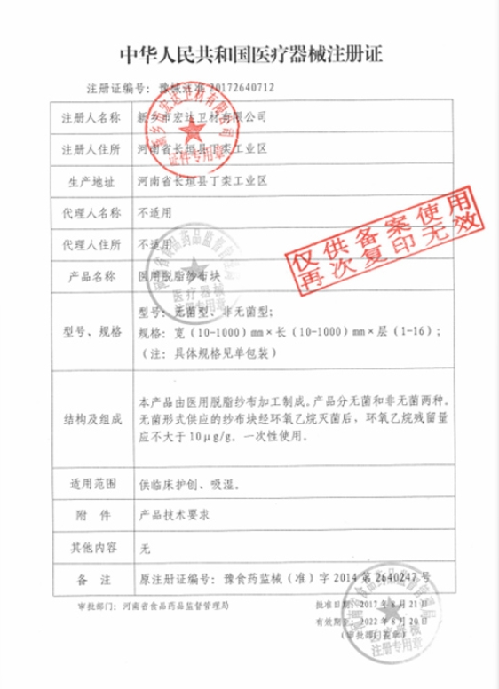 宏達醫(yī)用脫脂紗布塊I型:由脫脂棉紗布加工制成,供臨床護創(chuàng)、吸濕。本品一次性使用,用后應銷毀。包裝破損,禁止使用。使用前對產(chǎn)品有效期進行確認,在有效期內(nèi)使用,禁止重復使用。