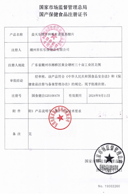 雙海益天樂(lè)牌多種維生素氨基酸片保健功能:本品經(jīng)動(dòng)物實(shí)驗(yàn)評(píng)價(jià),具有增強(qiáng)免疫力的保健功能;適宜人群:免疫力低下者;不適宜人群:少年兒童、孕婦、乳母。每日2次,每次2片,口服。本品不能代替藥物;適宜人群外的人群不推薦食用本產(chǎn)品。