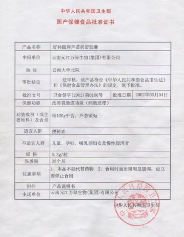 艾申特好體面牌蘆薈潤舒膠囊保健功能:改善胃腸道功能(潤腸通便);適宜人群:便秘者;不適宜人群:兒童、孕婦、哺乳期婦女及慢性腹瀉者。每日2-3次,每次2-3粒。本品不能代替藥物。食用時如出現(xiàn)明顯腹瀉,應(yīng)立即停止食用。