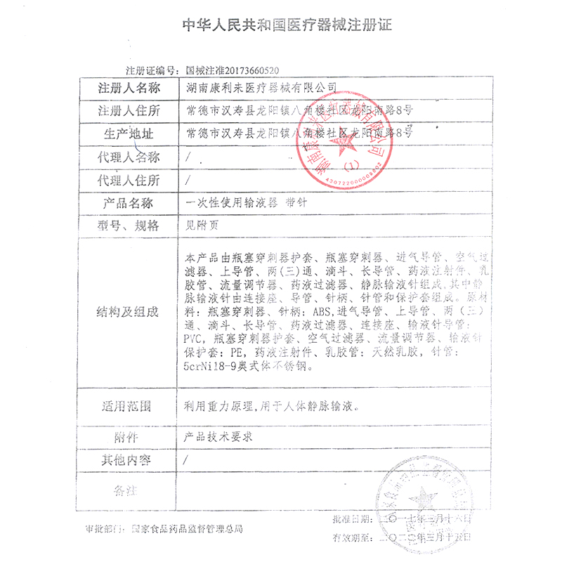 一次性使用輸液器 帶針(康利來)由瓶塞穿刺器護(hù)套、瓶塞穿刺器、進(jìn)氣導(dǎo)管、空氣過濾器、上導(dǎo)管、兩(三)通、滴斗、長導(dǎo)管、藥液注射件、乳膠管、流量調(diào)節(jié)器、藥液過濾器、靜脈輸液針組成。