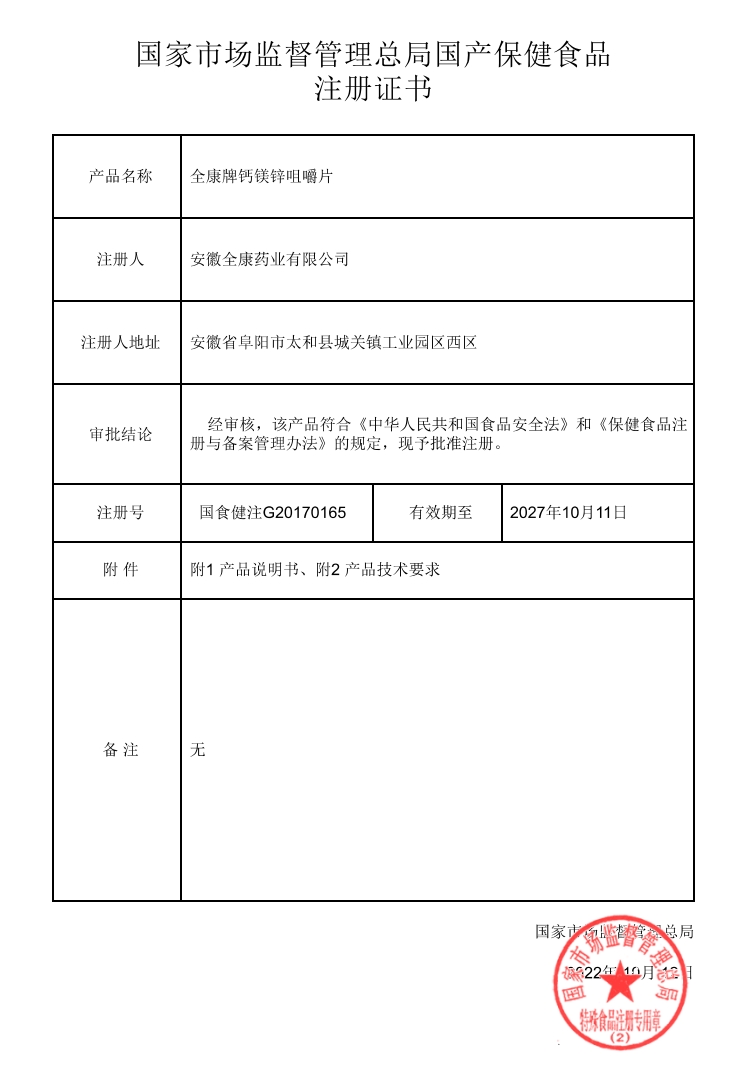 全康牌鈣鎂鋅咀嚼片保健功能:補充鈣、鎂、鋅;適宜人群:需要補充鈣、鎂、鋅的7-10歲人群、成人;不適宜人群:6歲以下人群、孕婦、乳母。