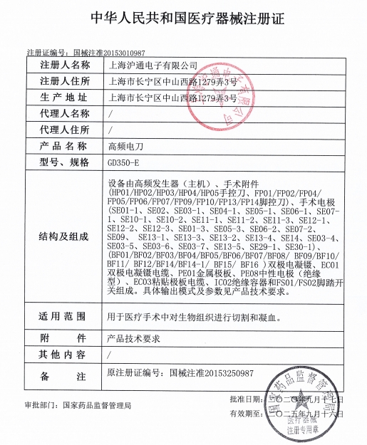 GD350-E高頻電刀用于醫(yī)療手術中對生物組織進行切割和凝血。設備由高頻發(fā)生器(主機)、手術附件、手術電極、 雙極電凝鑷、EC01雙極電凝鑷電纜、PE01金屬極板、PE08中性電極(絕緣型)、EC03粘貼極板電纜、IC02絕緣容器和FS01/FS02腳踏開關組成。