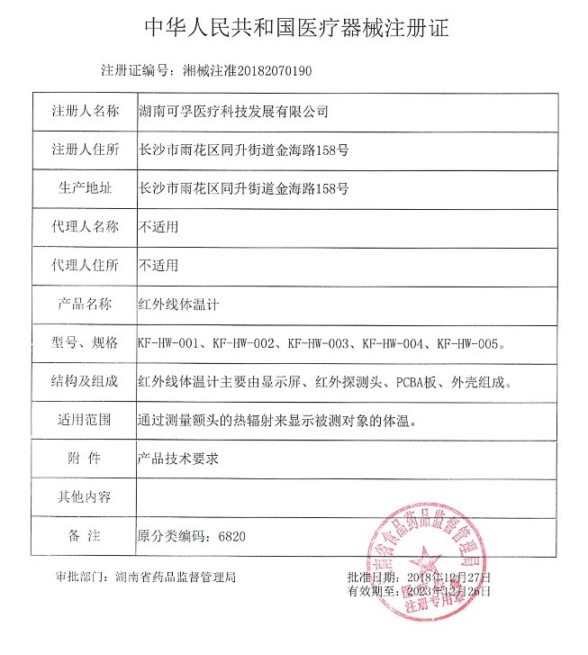 可孚紅外線體溫計(KF-HW-014)主要由顯示屏、紅外探測頭、PCBA板、外殼組成。通過測量額頭或耳腔的熱輻射來顯示被測對象的體溫。