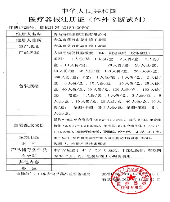 海氏海諾早早孕測(cè)定試紙(人絨毛膜促性腺激素測(cè)定試紙)適用于早期妊娠的檢測(cè)。主要組成成分:膠體金標(biāo)記的鼠抗α-HCG單克隆抗體(8μg~12μg/mL),檢測(cè)線(T線)區(qū)包被鼠抗β-HCG單克隆抗體(0.8μg~1.2μg/mL)等。