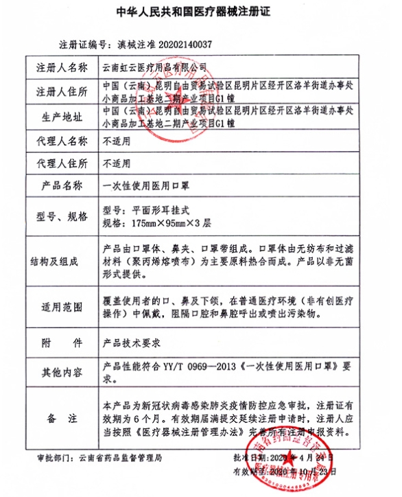 紅云錦華一次性使用醫(yī)用口罩由口罩體、鼻夾、口罩帶組成。口罩體由無紡布和過濾材料(聚丙烯熔噴布)為主要原料熱合而成。覆蓋使用者的口、鼻及下頜,在普通醫(yī)療環(huán)境(非有創(chuàng)醫(yī)療操作)中佩戴,阻隔口腔和鼻腔呼出或噴出污染物。