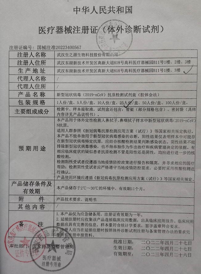注冊(cè)證號(hào):國(guó)械注準(zhǔn)20223400567批件 生產(chǎn)廠家:武漢生之源生物科技股份有限公司