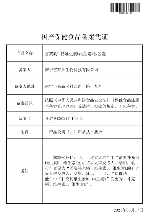 富萊欣鈣維生素D維生素K軟膠囊保健功能:補(bǔ)充鈣、維生素D、維生素K;適宜人群:需要補(bǔ)充鈣、維生素D、維生素K的4-17歲人群及成人、孕婦、乳母;不適宜人群:3歲以下人群。每日1次,每次1片,食用方法:口服。