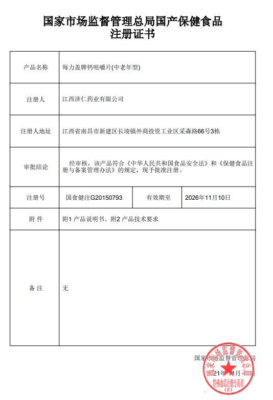 每力蓋牌鈣咀嚼片(中老年型)保健功能:補(bǔ)充鈣;適宜人群:需要補(bǔ)充鈣的中老年人;不適宜人群:17歲以下人群、孕婦、乳母。每日1次,每次1片,嚼食。本品不能代替藥物。適宜人群外的人群不推薦食用本產(chǎn)品;不宜超過(guò)推薦量或與同類(lèi)營(yíng)養(yǎng)素同時(shí)食用。