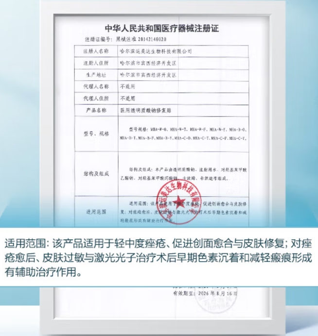 仁和醫(yī)用透明質(zhì)酸鈉修復(fù)貼適用于輕中度痤瘡、促進創(chuàng)面愈合與皮膚修復(fù);對痤瘡愈后、皮膚過敏與激光光子治療術(shù)后早期色素沉著和減輕瘢痕形成有輔助治療作用。對外用透明質(zhì)酸類制品有過敏史者禁用。