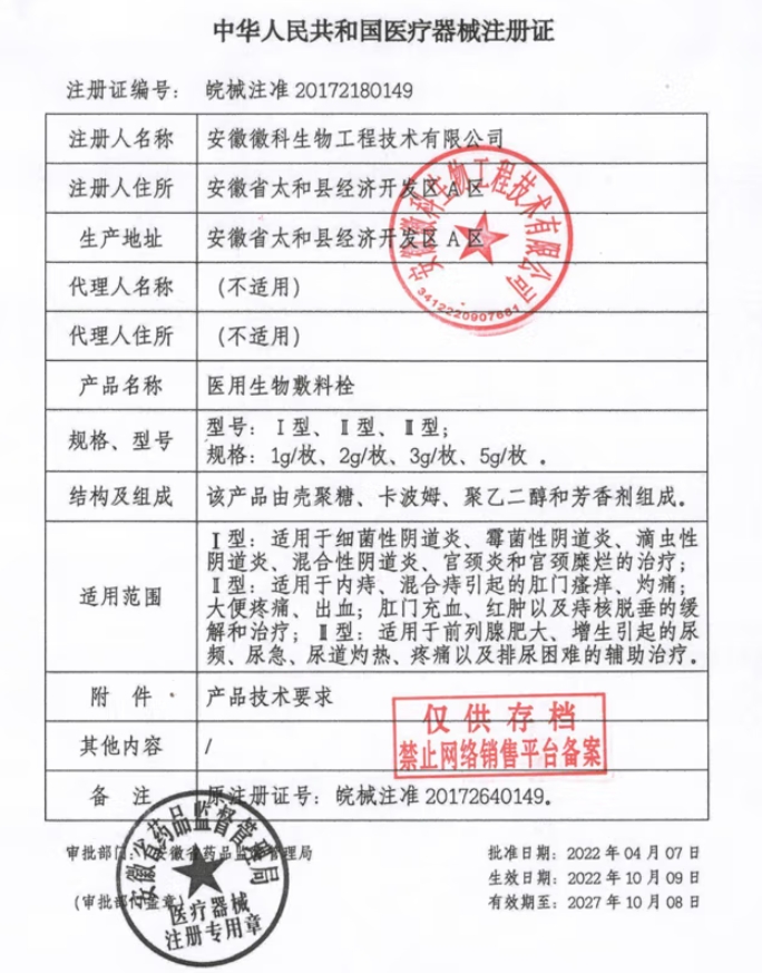散嚴(yán)寧醫(yī)用生物敷料栓Ⅱ型:適用于內(nèi)痔、混合痔引起的肛門瘙癢、灼痛;大便疼痛、出血;肛門充血、紅腫以及痔核脫垂的緩解和治療;使用本品前請清洗肛門周圍,請使用指套將栓劑推入肛腸深處。每次1枚,應(yīng)至少連續(xù)使用7天。