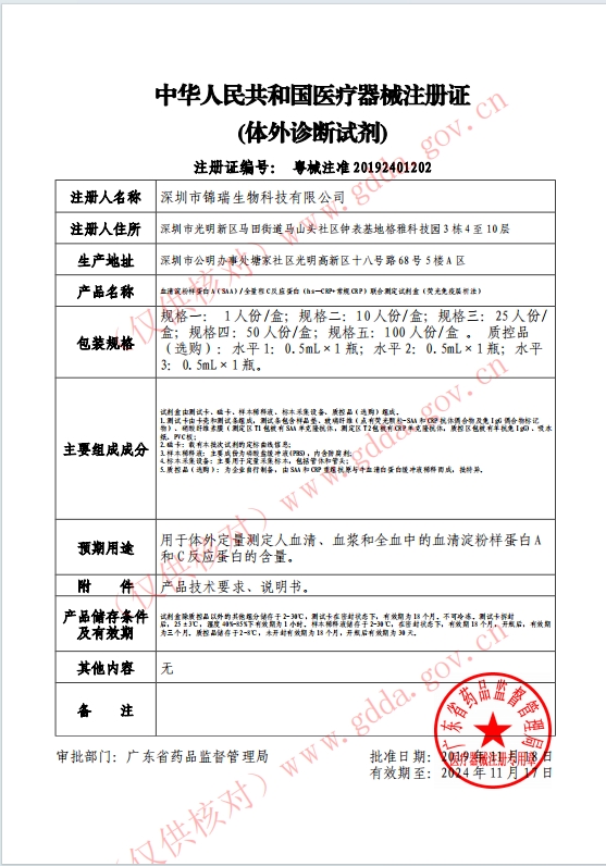 注冊證號:粵械注準(zhǔn)20192401202批件 生產(chǎn)廠家:深圳市錦瑞生物科技有限公司