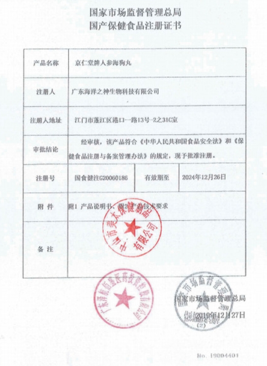 伊美堂京仁堂牌人參海狗丸保健功能:本品經(jīng)動物實(shí)驗(yàn)評價,具有緩解體力疲勞的保健功能;適宜人群:易疲勞者;不適宜人群:少年兒童、孕婦、乳母。每日2次,每次6粒,口服。