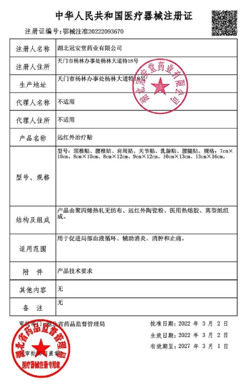 遠(yuǎn)紅外治療貼(痛可貼/濟(jì)壽祥/南京同仁堂綠金家園)由聚丙烯熱軋無(wú)紡布或聚酯纖維水刺無(wú)紡布、遠(yuǎn)紅外陶瓷粉、醫(yī)用熱熔膠、離型紙組成。用于促進(jìn)局部血液循環(huán)、輔助消炎、消腫和止痛。