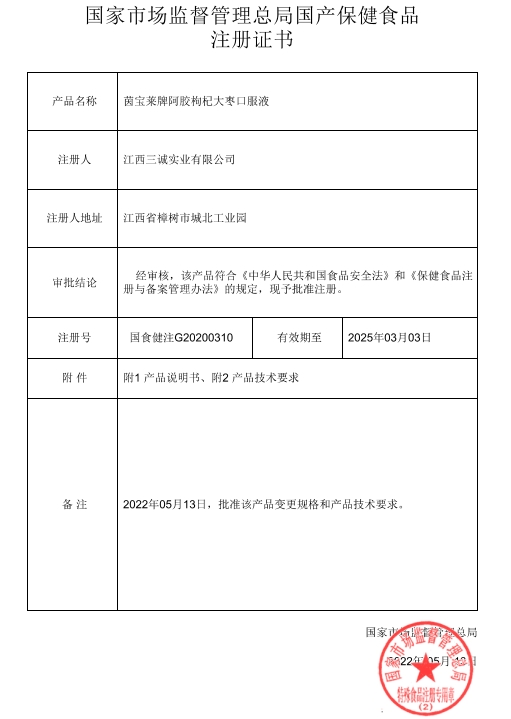 盛世三誠(chéng)茵寶萊牌阿膠枸杞大棗口服液保健功能:本品經(jīng)動(dòng)物實(shí)驗(yàn)評(píng)價(jià),具有增強(qiáng)免疫力的保健功能;適宜人群:免疫力低下者;不適宜人群:少年兒童、孕婦、乳母。每日3次,每次10mL,口服。