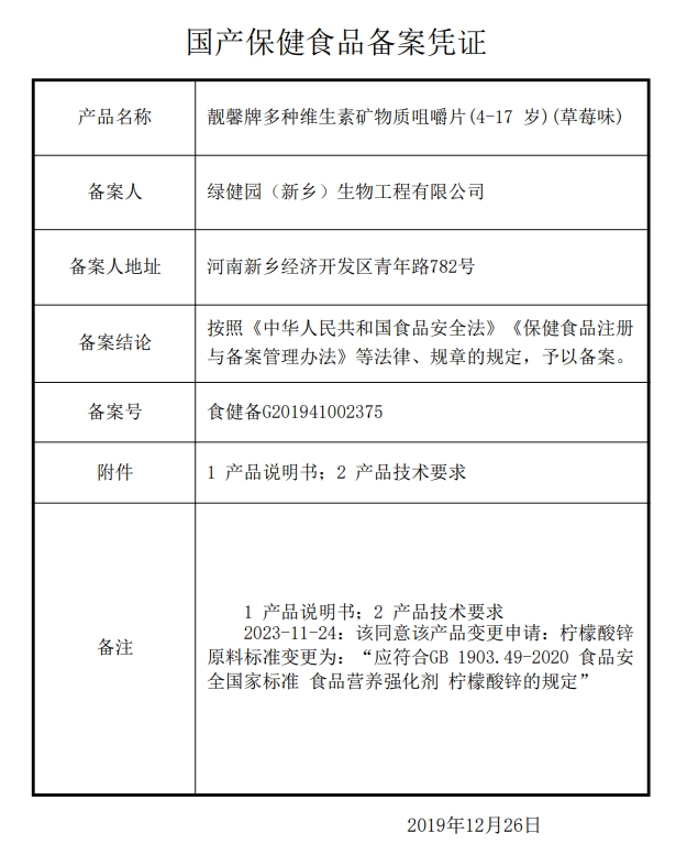 維元滿靚馨牌多種維生素礦物質(zhì)咀嚼片(4-17歲)(草莓味)保健功能:補充多種維生素礦物質(zhì);適宜人群:需要補充多種維生素礦物質(zhì)的4-17歲人群;不適宜人群:3歲以下人群及成人、孕婦、乳母。每日1次,每次2片;食用方法:咀嚼食用。本品不能代替藥物。高硒地區(qū)人群不宜食用。