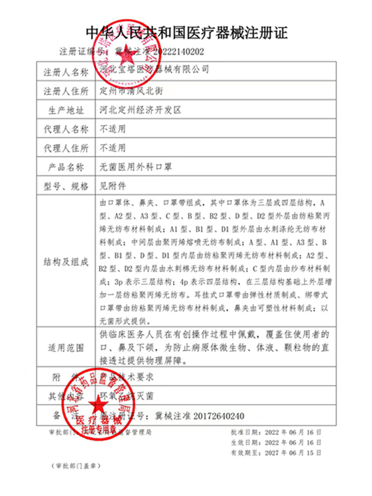 寶塔無菌醫(yī)用外科口罩由口罩體、鼻夾、口罩帶組成,其中口罩體為三層結(jié)構(gòu),外層由紡粘聚丙烯無紡布材料制成;中間層由聚丙烯熔噴無紡布制成;內(nèi)層由紡粘聚丙烯無紡布材料制成;耳掛式口罩帶由彈性材質(zhì)制成、綁帶式口罩帶由紡粘聚丙烯無紡布材料制成,鼻夾由可塑性材料制成;以無菌形式提供。