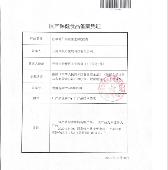 紅楓葉鈣維生素D軟膠囊保健功能:補(bǔ)充鈣、維生素D;適宜人群:需要補(bǔ)充鈣、維生素D的4-17歲人群及成人、孕婦、乳母;不適宜人群:3歲以下人群。每日1次,每次2粒;食用方法:口服。
