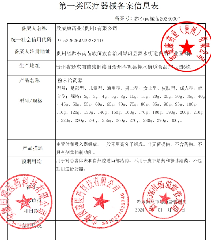 成康百健清涼熱痱粉粉末給藥器由管體和吸入器組成。一般采用高分子組成。非無菌提供。不含藥物。不具有劑量控制功能。用于對患者體表和自然腔道局部給藥。不用于皮下給藥和靜脈給藥。不包括陰道給藥器。