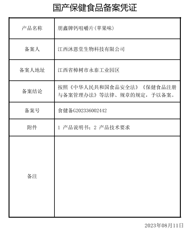 朋鑫牌鈣咀嚼片(蘋果味)保健功能:補充鈣;適宜人群:需要補充鈣的4-17歲人群及成人、孕婦、乳母;不適宜人群:3歲以下人群。4-10歲、14-17歲、孕婦:每日2次,每次1片;11-13歲及成人、乳母:每日3次,每次1片;食用方法:咀嚼。