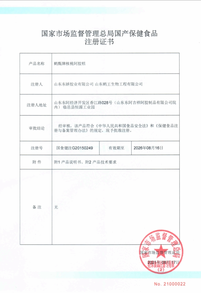 鶴王鶴甄牌核桃阿膠糕保健功能:本品經動物實驗評價,具有增強免疫力的保健功能;適宜人群:免疫力低下者;不適宜人群:少年兒童、孕婦、乳母。每日1次,每次15g(1塊),沿撕拉口處撕開包裝袋即可食用。